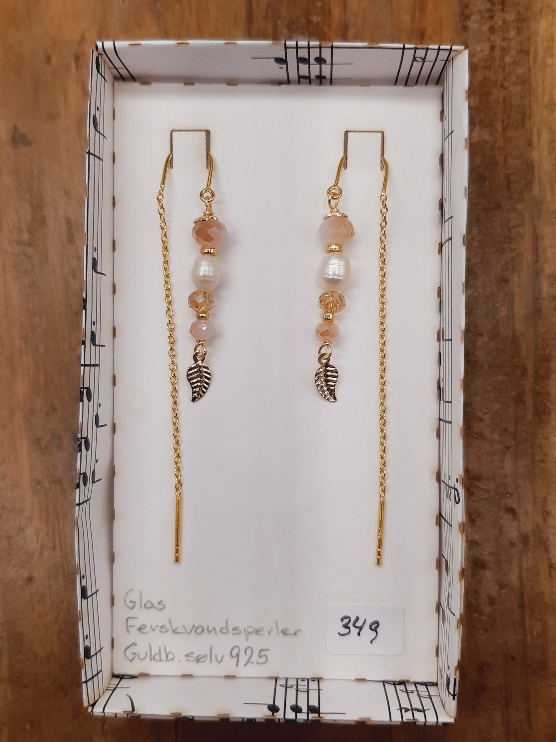 Gylden facetglas, ferskvandsperle og blad i tråd