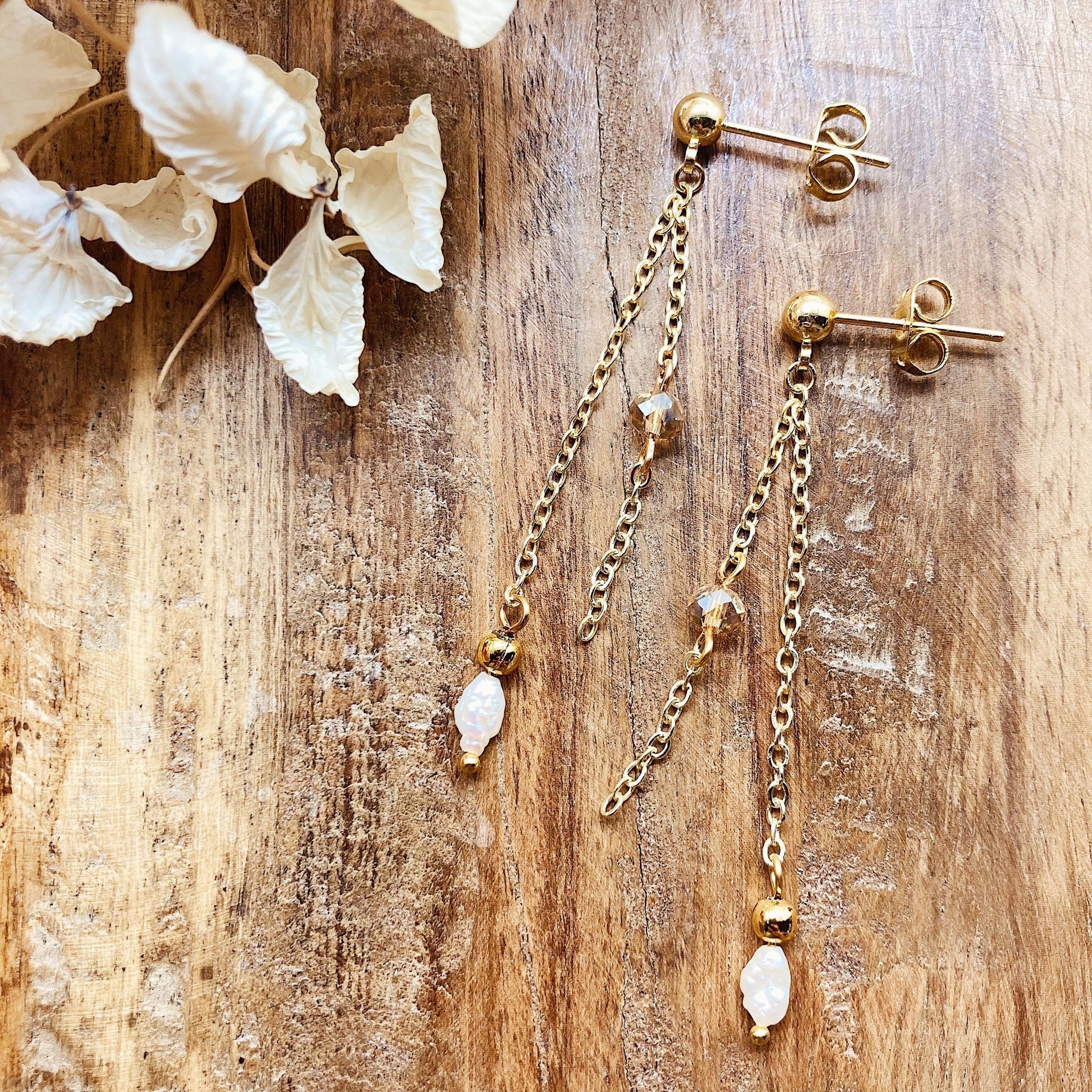 De fineste øreringe med guldbelagt kæde monteret på stikker. I kæden er der en facetslebet glasperle i gammelrosa samt en hvid aflang ferskvandsperle.